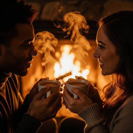 A cozy scene with hands holding a steaming cup near a fireplace, creating a warm and intimate moment.