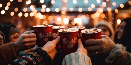 A joyful composition of People hands holding cups of hot cocoa with marshmallows, Close up of friends toasting with mug. Festive Christmas market bokeh lights, wide banner