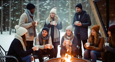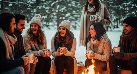 Group of friends sitting by the fire and drinking hot coffee in winter