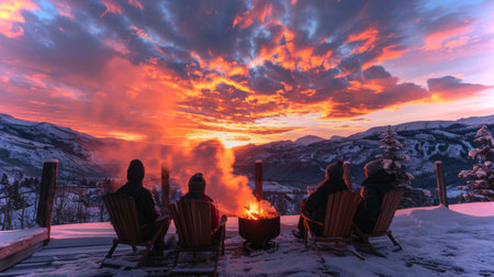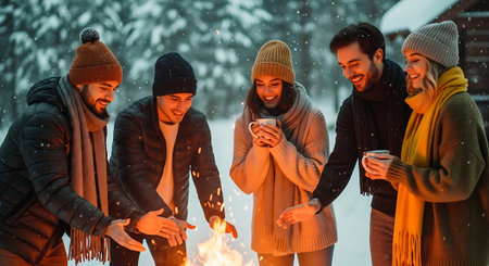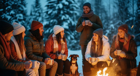 Friends gather around a warm campfire during winter evening, enjoying hot drinks and festive lights in a cozy outdoor setting