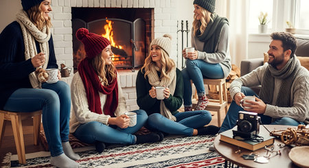 Group of friends in warm sweaters sitting by the fireplace and drinking tea.