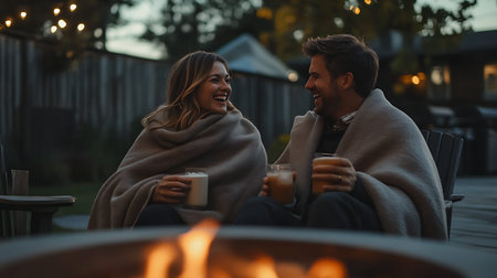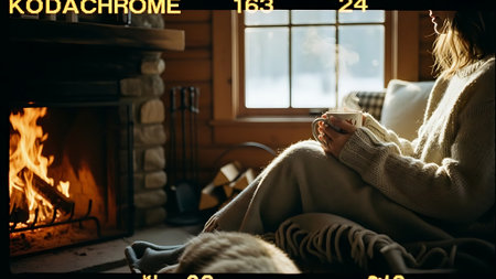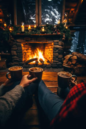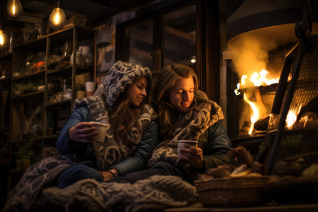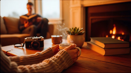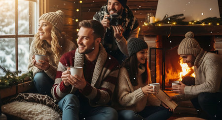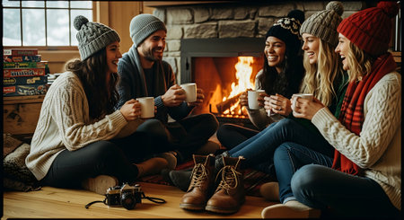 Cozy Moments: Indoor shots of people by a warm fire, sipping hot cocoa, or wrapped in blankets to convey the cozy feeling of winter. - Generative AI