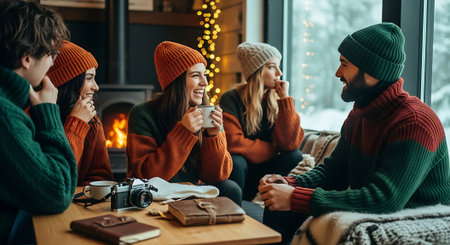 Group of friends in warm sweaters and hats sitting at the table in front of fireplace and drinking hot beverage.