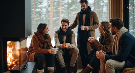 Group of friends sitting in front of fireplace and drinking hot tea or coffee.