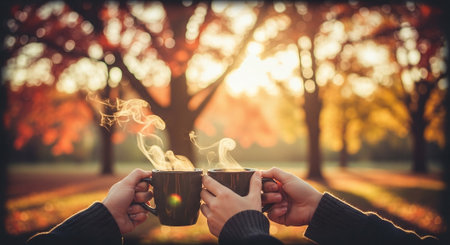 A couple sitting on a bench outdoors, enjoying hot beverages, surrounded by autumn foliage, with a cozy atmosphere