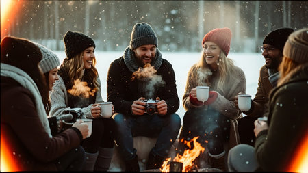 A group of friends enjoying hot beverages in a snowy landscape, dressed in winter clothing, smiling and laughing together