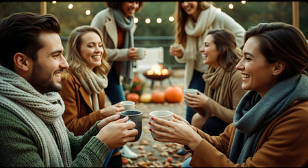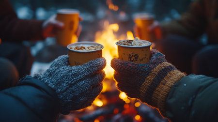 Friends sharing warm drinks around a cozy campfire on a chilly evening in a forest setting. Generative AI