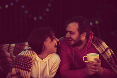 couple of lovers having fun drinking coffee or tea while they talk and laughing Outdoors covering themselves with blanket at romantic party. Great warm evening. concept of active recreation and travel