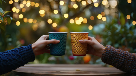 Two hands holding vibrant mugs create a warm and inviting atmosphere as twinkling lights shine in a lush outdoor setting, perfect for cozy gatherings.