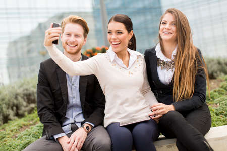 People taking selfie at business meeting. business concept