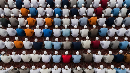 Muslim men peacefully praying in a mosque during eid, showcasing unity and community