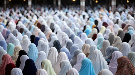 Large crowd of people in traditional Muslim clothing attending a religious event, AI Generated