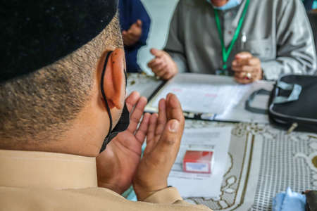Group of Muslim men in traditional clothes praying together at the mosque.