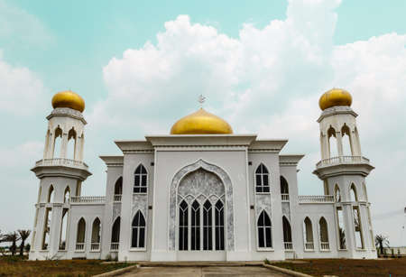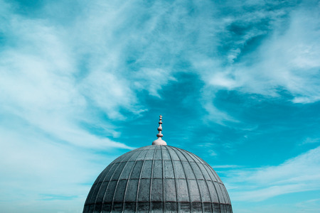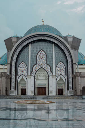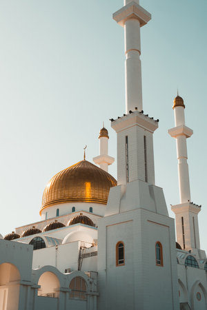 Exterior religious building of Islamic religion and faith. Mosque with high minarets on a sunny autumn day against the sky, outdoors.