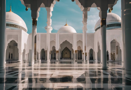 Stunning interior of an ancient Islamic architecture with arched doorways, intricate tilework, and reflective marble floors in rich blue tones