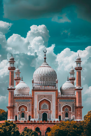 The intricate patterns of a South Asian mosque with a clear sky above, perfect for spiritual content.