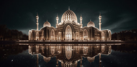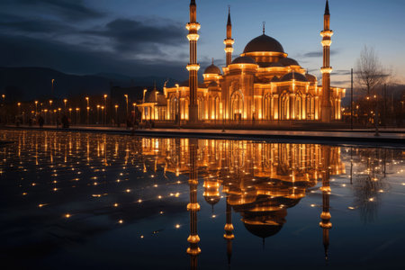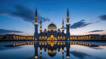 A grand mosque is showcased, bathed in warm light against a twilight sky. Its architecture is emphasized by symmetrical reflections on a calm water surface. The composition uses symmetry and an expansive view to enhance its appeal. This image could be suitable for editorial or commercial content.