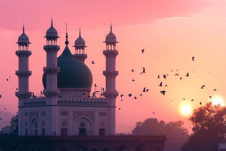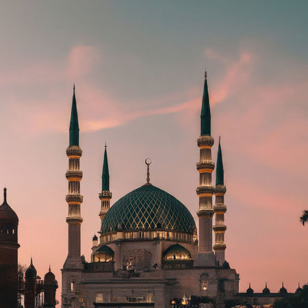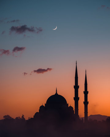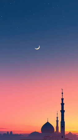 A symbol of faith and tranquility. This image captures the beauty of an Islamic place of worship during the golden hour, featuring a clear crescent moon, representing hope and new beginnings.