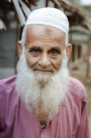 Paigacha, Bangladesh - circa July 2012: Old native man with long white beard dressed in pink shirt wears white cap on head in Paigacha, Bangladesh. Documentary editorial.