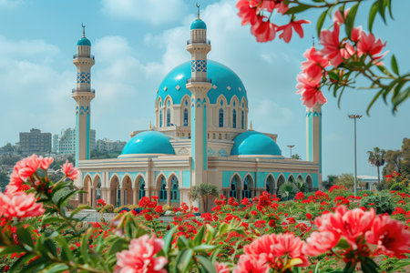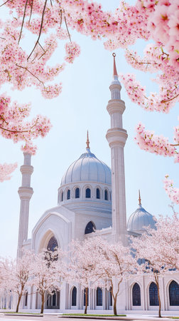 Grand Mosque with Cherry Blossoms in Full Bloom, Elegant Dome and Minarets