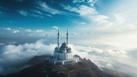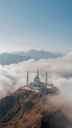 A low angle shot capturing the intricate architecture and grandeur of a mosque, showing its ornate minarets, dome, and decorative details.