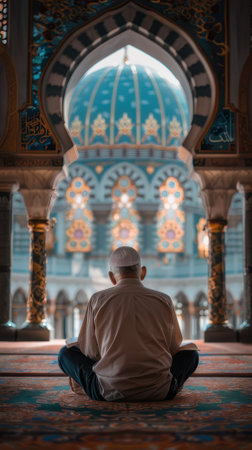 Muslim man praying inside of the mosque. Ramadan Kareem concept.
