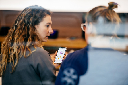 Berlin, August 29, 2018: The buyer looks to buy a new modern iPhone X and installed in it applications with photos or pictures in the official Apple store in Berlin in Germany.