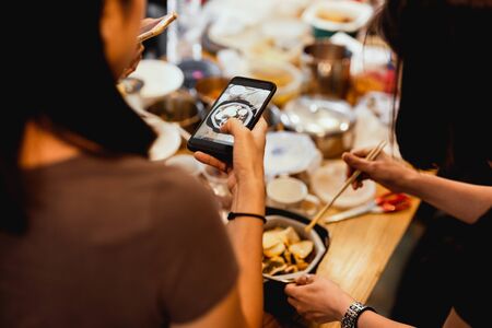 Young woman taking a photo with her smartphone of her asian friend. Friends in a coffee shop.