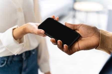 The image depicts a hand passing a smartphone to another hand. The scene is set against a white background, making the focus solely on the interaction between the two hands and the smartphone. This image is ideal for use in contexts related to technology, communication, and digital interaction.