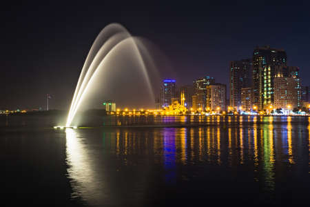 SHARJAH, UAE - OCTOBER 29, 2013: Musical fountain show. The Sharjah Fountain is one of the biggest fountains in the region.