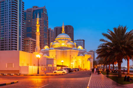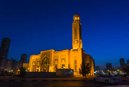 Al Noor Mosque in Sharjah at night. United Arab Emirates