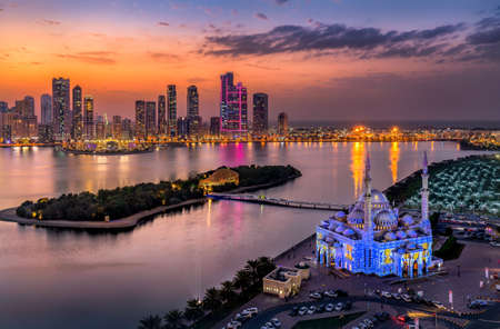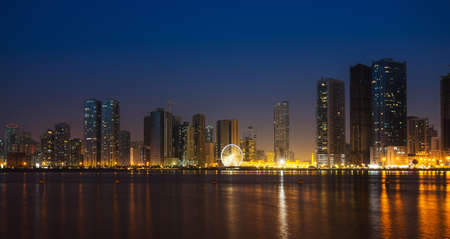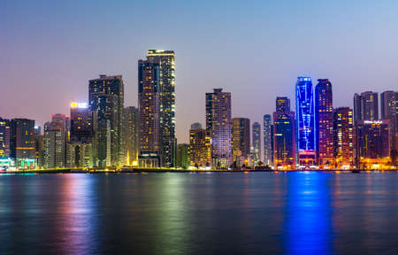 Sharjah modern waterfront cityscape in UAE at blue hour