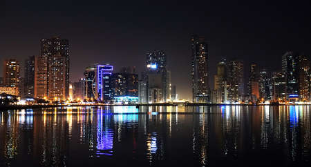 United Arab Emirates beautiful buildings. Sharjah view in the night. Reflection of the city in water.