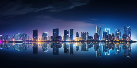 Tall skyscrapers illuminate the night with their lights reflecting beautifully on the calm waters beneath. This vibrant cityscape showcases urban energy and architectural design.