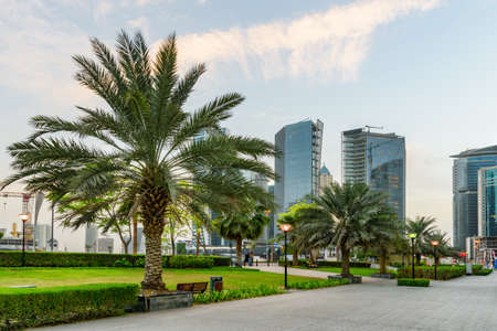 Beautiful view of a park among skyscrapers at downtown of Dubai.