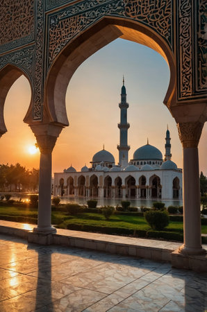 Beautiful sunset over a mosque framed by intricate architectural arches in a serene garden setting