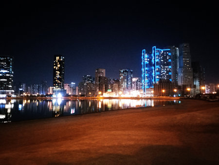 A beautiful night view of Sharjah cityscape and waterfront during the light festival in UAE