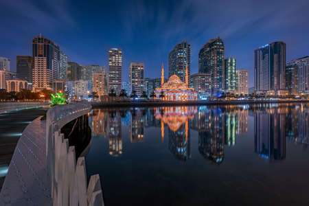 Sharjah city reflected in Khalid lake at night. United Arab Emirates