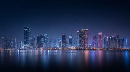 A stunning nighttime city skyline showcases remarkable skyscrapers illuminated in various vibrant colors. The sleek buildings reflect beautifully in calm waters, creating a serene urban landscape perfect for travelers and photographers.