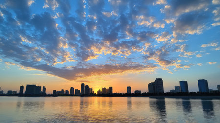 A stunning city skyline at dusk, featuring modern skyscrapers illuminated with vibrant lights, beautifully reflected on a calm water surface.