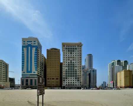 Sharjah, UAE - April 8. 2018. Multi-storey residential and office buildings with sand in foreground