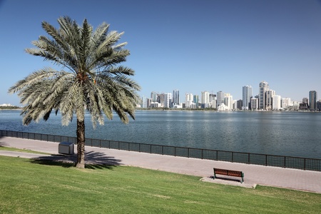 Palm Trees Garden in Sharjah, UAE. Which is located on Sharjah Corniche. High-rise buildings overlook the sea and the palm garden
