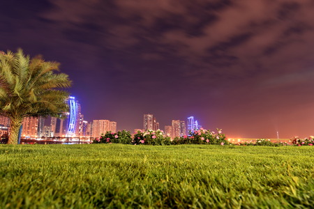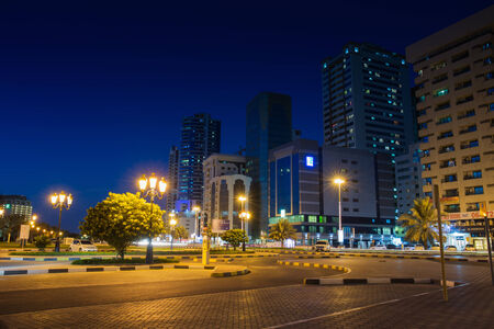 Sharjah downtown night scene with city lights, luxury new high tech town in middle East