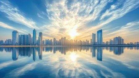 Breathtaking Cityscape with Skyscrapers Reflecting on Tranquil Water Under a Clear Blue Sky.