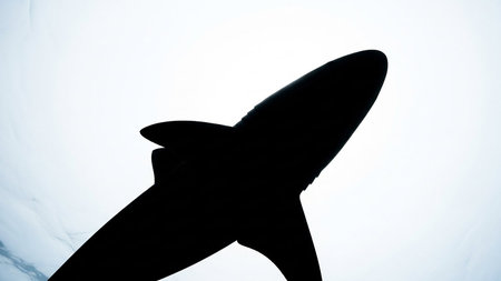 A black silhouette of a shark swims underwater against a bright white background. Clear details and vibrant co...