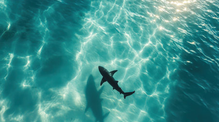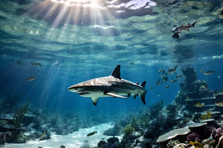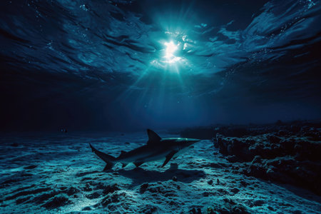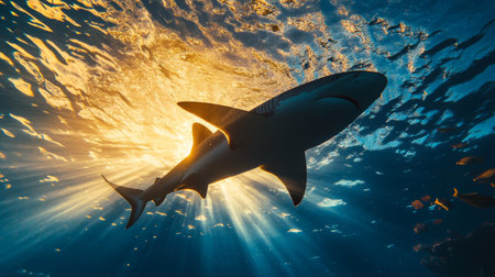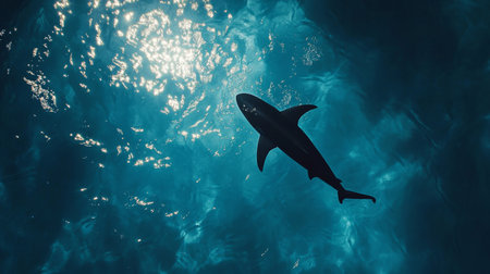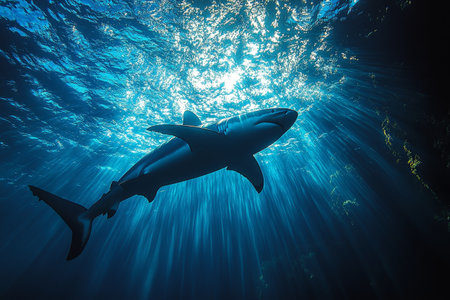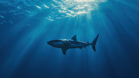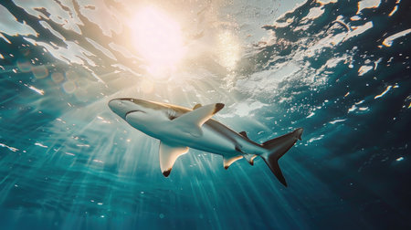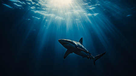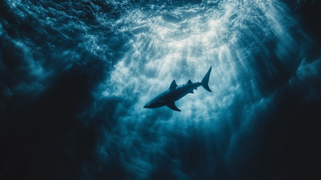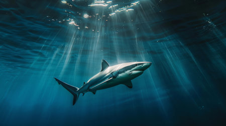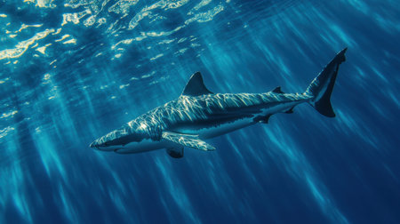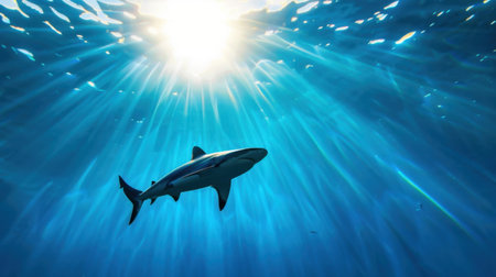 Shark swimming underwater with sunlight filtering through blue ocean surface, marine wildlife scene. Underwater exploration and marine conservation concept