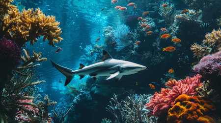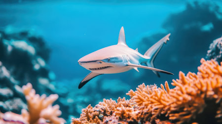 A lone shark swimming gracefully in crystal-clear waters, surrounded by vibrant coral reefs.
