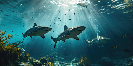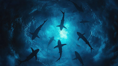 A group of sharks swimming silently through deep blue waters, creating an awe-inspiring, slightly eerie underwater scene.