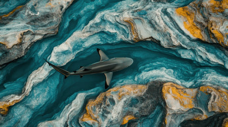 This stunning aerial photograph showcases a shark gliding through turquoise waters surrounded by colorful rock formations, highlighting the beauty of marine life.
