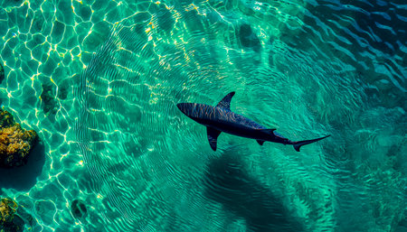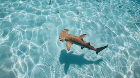Overhead shot of a small shark's silhouette gliding in shallow, crystal-clear turquoise water, with sunlight ripples -